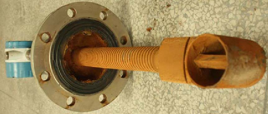 2007年12月,我公司将研发成功的Wv-i插入式抗振型涡街流量交付山东青岛某热电厂使用,将该流量计安装在换热站热水总管上,现场流体(换热站进水)脏污程度较高,管壁结垢严重,经过4年的使用(期间未经任何维护),我公司将该涡街流量计进行返厂检查,情况如下: