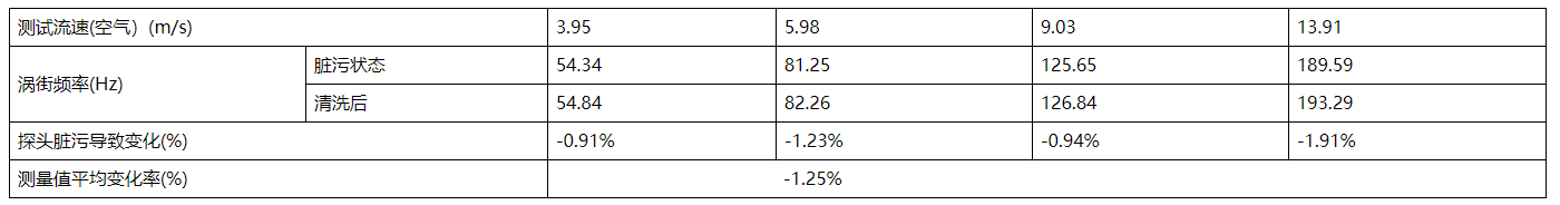 根据上述标定测试记录得出结论,此种程度的脏污,造成流速测量-1.25%的附加测量误差,这一检测结果与理论分析吻合:原因在于,附着污物使后发生体宽度增大,导致仪表系数下降。
